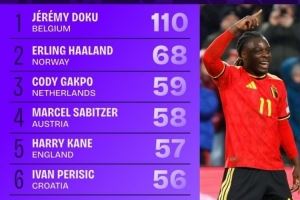 世欧预对方禁区触球榜:多库断崖领跑,哈兰德、加克波、凯恩在列